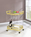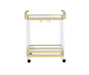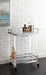 Modern meets function with the Aerin Serving Cart. Bold acrylic, tempered glass and chrome combine to create a focal point when serving your guests. Features include two shelves for serving and display, casters for ease of movement, stemware storage under top shelf and a three ring wine bottle holder on bottom shelf. So simple, yet so functional! Your purchase includes one serving cart.