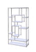 - Bookcase built with staggered shelves for visual interest and additional display or storage areas