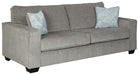 If style is the question, then this sofa is the answer. Sporting clean lines and sleek track arms, the decidedly contemporary profile is enhanced with plump cushioning and a chenille-feel upholstery that's so pleasing to the touch. Sure to play well with so many color schemes, this sofa in slate gray includes a pair of understated floral pattern pillows for fashionably fresh appeal.