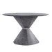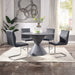 The Ansonia dining set features a pedestal dining table with a fixed round top and a trendy faux concrete finish. The matching side chairs are perched on sled metal bases with shiny chrome finish that contrasts beautifully with the gray PU upholstery on the padded seat and backs. In addition, decorative quilt-like stitching on the chair upholstery creates visual texture that looks as good as it feels.