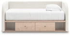 Details Includes upholstered daybed side panels, back panel, under bed storage unit, rails and roll slats , Made with engineered wood (MDF/particleboard/plywood) and decorative laminate for the right balance of affordability and durability , Smooth, light finish with replicated oak grain, Decorative laminate replicates natural or man-made material surfaces with consistent color, pattern and texture , Knobs with black finish, 2 smooth-gliding storage drawers, 2 open cubbies accommodate 10.5"W x 10.5"D x 11"H cube storage bins, Drawer interiors are lined with a faux linen laminate for a clean, finished look, Daybed uses mattress only, no box spring required , Mattress available, sold separately, Assembly required
