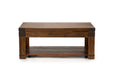 The Arusha Lift Top Cocktail Table with Casters features a spring lift tabletop that opens and closes smoothly to reveal two hidden storage spaces - sized just right for all your remotes. Below, the bottom shelf can be used to store larger items, and when it's time to vacuum or sweep, hidden casters make it easy to move the whole cocktail table. And you'll love its industrial-inspired style, which features metal accent plates in the corners as well as a medium cherry finish that highlights the natural grain of the solid hardwood and mango veneers.