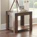 Simple, modern design elements with an industrial flair are found in the Arusha Occasional Collection. The end table is sturdily constructed of hardwood solids and mango veneers in a beautiful medium cherry finish with metal bracket accents. A bottom shelf provides extra space for storage or display. Also available in this collection are the lift-top cocktail table and sofa table (purchase separately). Your purchase includes one end table.
