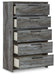 | Details | Made of engineered wood (MDF/particleboard) and decorative laminate, Smoky gray finish over replicated oak grain with authentic touch, Linear pulls with antiqued gunmetal finish, 5 smooth-gliding drawers, Drawer interiors are lined with a faux linen laminate for a clean, finished look, Safety is a top priority, clothing storage units are designed to meet the most current standard for stability, ASTM F 2057 (ASTM International), Drawers extend out to accommodate maximum access to drawer interior while maintaining safety | |