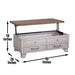 Add some function to your living room with the Lift-Top Cocktail Set from Bear Creek! Perfect for your farmhouse-inspired home, the Bear Creek Lift-Top Cocktail Table adds needed functionality to your life by giving you a work surface right on your sofa. Just lift-up the top of the Bear Creek and work or eat right from your sofa. The casual two-tone combination of white and honey smoke finish works well with any casual upholstery setting and features distressing that make the tables look like a vintage heirloom in any room.
