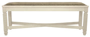 The beauty of this upholstered dining bench is something to savor. Serving up comfort and flair, this generously scaled bench entices with a cushioned seat covered in a heavy woven fabric that complements the antiqued white finish.
