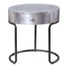 Assembled, Drum End Table Storage: 1 Drawer () Patchwork Aluminum Top/Drawer Metal Round Frame (Open) CONSTRUCTION Patchwork Aluminum Top/Drawer: Aluminum, Frame: Ply Metal Frame Base: Iron (Size 16"H)