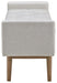 Contemporary style gets practical with this bench. The tufted beige seat cushion is hinged to allow easy access to whatever you need to hide in plain sight. Raised edges give the impression of arms, while the light brown finished wood legs help it blend with many different modern styles.