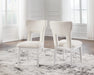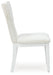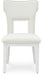 Embracing modern glamour, this dining chair is a dazzling addition to your dining area. A bright white lacquer finish and a contemporary cutout design give it a look all its own. The sumptuous upholstery wows with metallic thread accents.