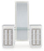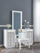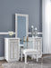 Details Includes vanity and mirror, Made with solid wood components, MDF substrate and decorative PVC laminate, Bright white lacquer finish, Vertical metal drawer pulls, Built-in LED lighting with 3-way dimmer switch, 3 drawers with fully finished interiors, English dovetail construction and heavy-duty ball-bearing side glides, Drawers with rhinestone frames; textured laminate drawer fronts, 110V power supply with USB-A and USB-C charging ports, Power cord included; UL Listed, Mirror with rhinestone frame; attaches to back of dresser