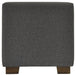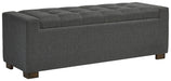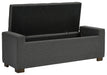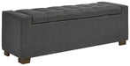 Details Polyester upholstery in gray, Wood legs with brown finish, Tufted seat cushion, Hinged seat, Interior storage