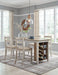 Raise the bar on small space living with this 5-piece counter-height dining set. An inspired choice for coastal chic or modern farmhouse settings, this strikingly simple table marries a brown tone plank-effect top with a rubbed-through grayish white base for timeworn appeal. The table’s side shelves and 8-bottle wine rack cleverly balance form and function while the comfortably cushioned bar stools with classic ladderback styling serve up high style.