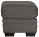 The contemporary farmhouse styling of the Cutler ottoman is a perfect companion piece to the Cutler chair. Elevate your comfort by putting your feet up to relax. Covered in a soft, durable 100% polyester body fabric in a light gray color the Cutler brings style to any room. The look is completed with pewter finished nailhead accents along the base.