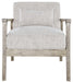 Keep your seating casually cool with this accent chair. The clean-lined design sports a gray finish for a modern appeal, while light neutral upholstery in a herringbone pattern creates textural interest. Antiqued pewter-tone accents add a touch of urban flair, rounding out this relaxed take on contemporary style.