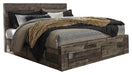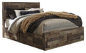 Modern yet hefty. This queen panel bed with storage makes an urban eclectic statement. Seasoned raw wood look merges with the clean lined design we love today. Muted rustic finish over replicated pine grain maintains its authenticity for a beauteous look. Storage in the footboard and underneath the bed provides ample space for placing belongings out of sight. Mattress available, sold separately.