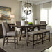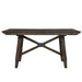Gather the family around the Double Bridge optional gathering table set, consisting of the trestle table and four upholstered counter chairs. Crafted of rubberwood solids and acacia veneers, this kit features a dark chestnut finish with wire brushing. The table offers two 12-inch leaves, one for each end of the table, to accommodate guests or a larger family, and an easy glide track system for added convenience. The chairs feature grey linen upholstery and nylon chair glides to protect your flooring. The Double Bridge Dining defines the rustic side of casual. The sleek design is optimal for any space.