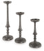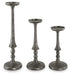 | Details | Set of 3, Made with cast aluminum, Antiqued pewter-tone finish, Each holds a 3” pillar candle (candles not included), Due to the finishing process of this product, some variations may occur | |