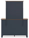 | Details | B414-87: Made with hardwood solids, mindi wood veneer and MDF substrates, Two-tone finish features a dark slate blue with a light brown wood-tone top, ¼" bolts (not included) are needed to attach headboard to your existing bed frame, Assembly required, B414B1: Includes dresser and mirror, Made with hardwood solids, mindi wood veneer and MDF substrates, Two-tone finish features a dark slate blue with light brown wood-tone top, Nickel-tone metal knobs, 6 drawers with fully finished interior, dovetail construction and heavy duty ball-bearing side glides, Mirror attaches to back of dresser, | |