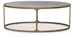 This coffee table blends a traditional feel with contemporary design cues. Antiqued gold texturing on the frame has the look of timeworn, hand-forged metal. A tempered glass top with a faux marble finish provides a refined contrast. Chic when hosting decor or holding entertainment essentials, this table rounds out your living room with transitional flair.
