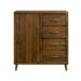 The Malibu 4-Drawer Chest in Walnut is a stunning addition to any bedroom. It features solid wood framing and mid-century style tapered legs for a sleek look. Enjoy versatile storage space with drawer and cabinet storage. The metal handles add a modern touch, while the top drawer is lined with black felt for a luxurious feel. With dust-proofing on the bottom layer and kenlin drawer guides, this chest is not only stylish but also highly functional. An anti-tipping kit is included for safety and peace of mind. Add a touch of mid-century elegance to your bedroom with this piece from the Malibu collection.