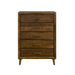 The Malibu 5-Drawer Chest in Walnut is a stunning addition to any bedroom. It features solid wood framing and mid-century style tapered legs for a sleek look. The metal handles add a modern touch, while the top drawer is lined with black felt for a luxurious feel. With dust-proofing on the bottom layer and kenlin drawer guides, this chest is not only stylish but also highly functional. An anti-tipping kit is included for safety and peace of mind. Add a touch of mid-century elegance to your bedroom with this piece from the Malibu collection.