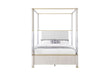 The Malmo Queen Canopy Bed is a stunning statement of modern luxury. Framed in a light beige oak veneer, it features acrylic posts accented with gold trim for a glamorous touch. The beige textured upholstered headboard adds softness and elegance, while matching gold accents on the canopy, headboard, and footboard complete the upscale look. With a fully slatted design for reliable support, this canopy bed is as functional as it is beautiful.