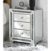 Assembled, Rectangular Night Table • Features: Mirrored Finish w/Faux Diamonds & Clear Glass, Mirrored Tapered Leg •• CONSTRUCTION •• Mirrored Case Frame: 4mm Beveled Mirror, MDF; TRIM]: Faux Diamonds Inlay, 4mm Clear Tempered Glass • Mirrored Tapered Leg • Drawer: GLIDE Side Metal (2/3 Ext.), DOVETAIL French Front, Full Black Finish Inside (Felt NOT Included), Safety Stop Included, Manual Close, Hardware: Single Knob, Sparkling Faux Gem