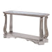 Entertain in style with the Northville Sofa Table. This classic rectangular occasional table features an Antique Silver and a tempered glass top. This distinctive cocktail is accented with wooden floral scrolled legs and a beveled glass insert and an open bottom shelf for ample storage and display. This stylish accent table has a captivating look that makes it an eye-catching piece in any room. Use it to add a touch of contemporary flair to a traditional space or to simply complete a modern aesthetic.