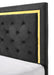 This bedroom collection offers a sophisticated palette, presenting a refined look that's both modern and timeless. The bed anchors the set with its plush, button-tufted headboard framed by a bold, gold accent trim, creating a luxurious focal point. The matching dresser, chest, and nightstand feature sleek, black surfaces complemented by gold hardware, adding a touch of elegance. Each piece stands on neat gold-finished legs, lifting the furniture off the ground and enhancing the feeling of spaciousness. The dresser's large mirror reflects light and adds depth, making it as functional as it is stylish.