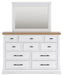 Details B844B2: Includes panel headboard, storage footboard, rails and roll slats, Footboard made with hardwood solids, MDF substrates and butcher block oak veneer, Headboard and rails made with hardwood solids and MDF substrates, White finish, Headboard with inset black metal barn sash, 2 drawers in footboard with fully finished interior, dovetail construction and ball-bearing side glides, Pulls with matte black finish, Bed does not require a foundation/box spring, Mattress available, sold separately, Assembly required, B844B1: Includes dresser and mirror, Made with hardwood solids, MDF substrates and butcher block oak veneer, Dresser with 2-tone finish (white finish; butcher block oak veneer with natural finish), Pulls with matte black finish, 10 spacious drawers with fully finished interiors (top drawers felt lined), dovetail construction and ball-bearing side glides , Drawers with inset picture fronts, Mirror attaches to back of dresser, B844-93: Made with hardwood solids, MDF substrates and butcher block oak veneer, 2-tone finish (white finish; butcher block oak veneer with natural finish), Pulls with matte black finish, 3 spacious drawers with fully finished interiors (top drawers felt lined), dovetail construction and ball-bearing side glides, 110V power supply with dual USB charging ports, Power cord included; UL Listed, Drawers with inset picture frame fronts,