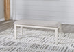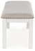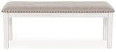 The Robbinsdale dining bench is sure to impress come mealtime. With its antiqued white finish and light gray upholstery with nailhead trim, modern farmhouse-style dining has never been so fashionable. All that's missing is you and your family.