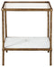 | Details | Made with sand casted aluminum, Antiqued brass-tone finish, Clear glass tabletop, White marble lower shelf, Assembly required | |