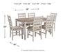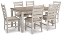 Set the scene for coastal chic or modern farmhouse living with this dining room table set. Clean-lined, simply striking table doubles the charm with a brown tone top with plank effect, paired with a grayish white base with rub through effect for timeworn appeal. Six chairs with classic ladderback styling and comfortably upholstered seats make room for one and all.