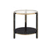 A luxurious modern piece that's also simple and chic, the end table features a round table top with three supporting legs. Champagne gold trims lend a sleek finishing touch and make the table look extra-stylish. Glass table top adds visual depth and interest to the design, while an open bottom shelf in faux black marble under the top is a great place to display your magazine collection or other decorations.