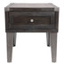 Take a stance for rustic-industrial style with this mixed material end table. Weather-washed pine wood and veneers are contrasted with canted metal legs and corner bracket accents for a uniquely chic merger of earthy beauty and contemporary flair. Power plug-ins and USB charging ports mounted on the back add practical function to great form.