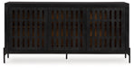 | Details | Made of mango wood, Exterior with black finish, Wire brushed effect, Interior with natural finish, Metal legs with black finish, 3 doors with magnetic push latch function, 3 shelves, Openings in back for electronics, Minor assembly required; simply lay flat and attach legs | |