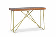 Solid mango wood in a warm pine finish is inlaid with a brass X pattern atop a modern brass finished iron base. Simple yet so stylish. Co-ordinating end table and sofa table are available for purchase separately.