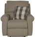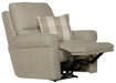 The WESTPORT power lay flat recliner features a Farmhouse Casual style with its Greek Key arm treatment, soft body fabric, and an accent pillow.