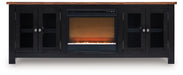 Raise the bar on modern farmhouse style with this TV stand with electric fireplace. Its sturdy silhouette and casual good looks are accentuated with a two-tone finish, which pairs a warm satin black base with a contrasting butcher block veneer top. Glass door cabinets with adjustable shelves offer plenty of storage for media and electronics. Adding that much more show-stopping style, the electric fireplace insert operates with or without heat and includes a six-level temperature setting, a remote control and an overheating control for added safety. It comes with faux glass crystals and natural stones, so you can customize the look of the flame bed.