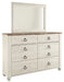 | Details | Includes dresser and mirror, Made of engineered wood (MDF/particleboard) and decorative laminate, Whitewash replicated worn through paint with authentic touch, Replicated wood grained block pattern with authentic touch, Antiqued brass-tone knocker hardware, 6 smooth-gliding drawers, Mirror attaches to back of dresser, Safety is a top priority, clothing storage units are designed to meet the most current standard for stability, ASTM F 2057 (ASTM International), Drawers extend out to accommodate maximum access to drawer interior while maintaining safety, Assembly required | |