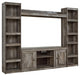 This entertainment center is sure to win your heart with its daring designer take on modern rustic. Its crisp, clean and minimalist-chic profile is enriched with a striking replicated oak grain with thick plank styling and a rustic gray finish for that much more authentic character. Crossbuck detailing adds a brilliant barn door inspired touch.